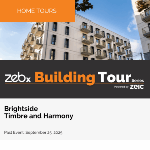 On September 25th, ZEBx hosted its fourth building tour of 2025 at Timbre and Harmony, a recently completed affordable housing project by Brightside Community Homes Foundation in Vancouver’s Grandview-Woodland neighbourhood. The development replaces two aging buildings with a pair of six-storey Passive House-certified buildings, delivering 157 new rental homes for seniors, people with disabilities, and individuals facing housing barriers.